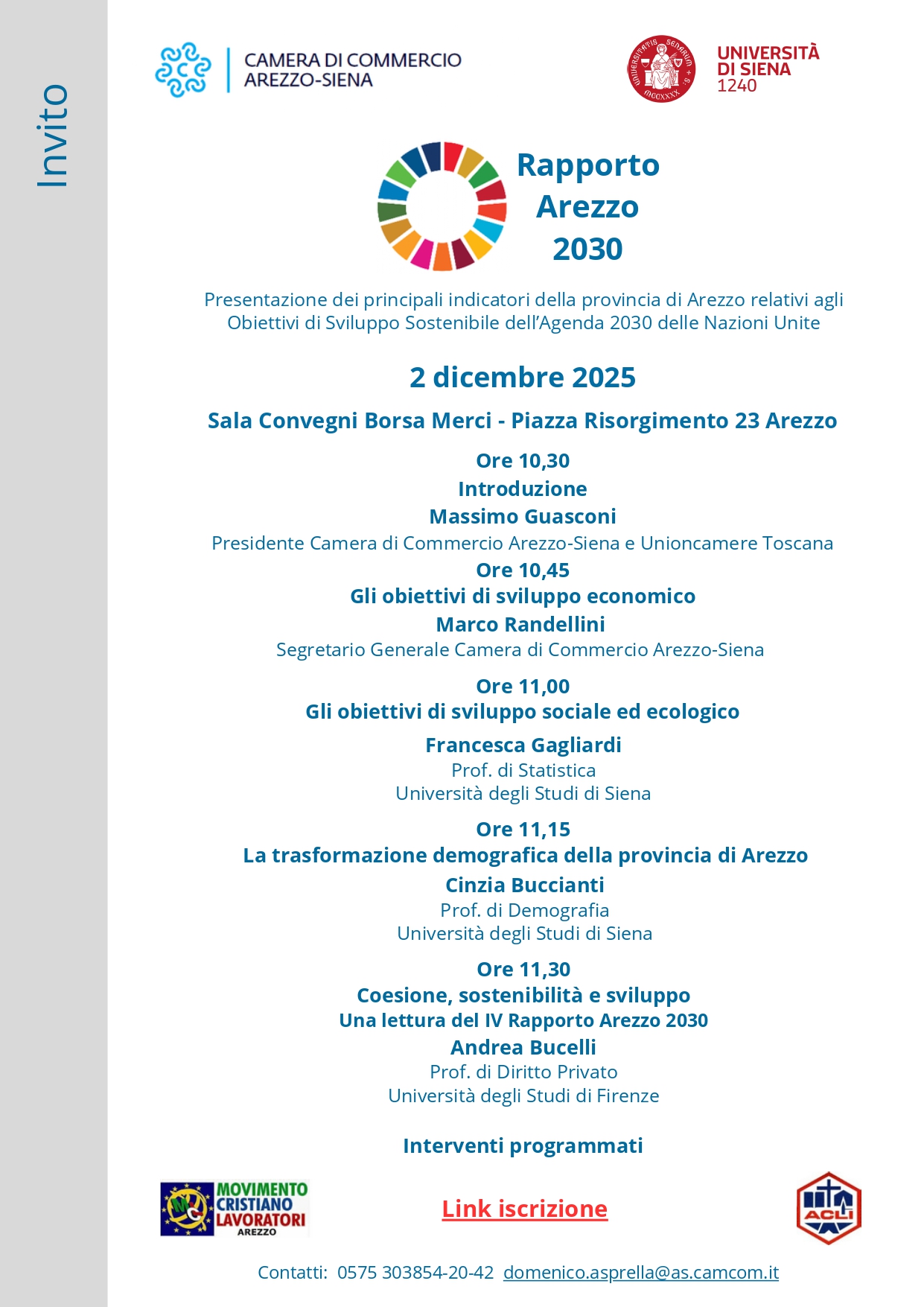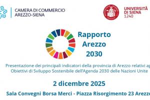 Camera di Commercio di Arezzo-Siena invita alla presentazione del Rapporto Arezzo 2030 che espone i principali indicatori della provincia di Arezzo relativi agli obbiettivi di sviluppo sostenibile (SDGs) dell'Agenda 2030 delle Nazioni Unite.